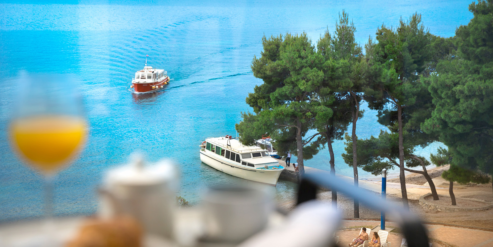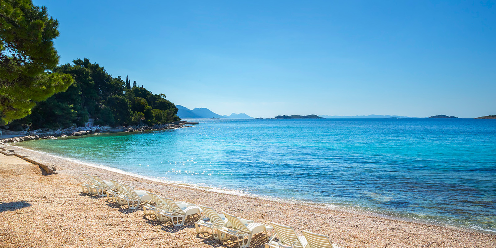 Direkte Strandlage mit Kiesstrand, umgeben von Pinienwald