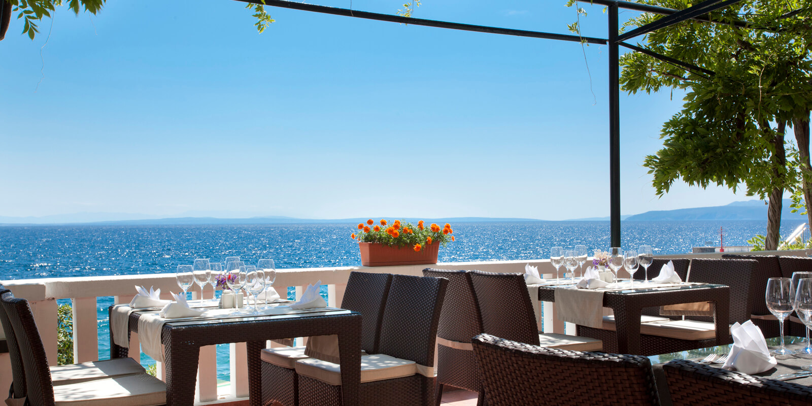 In malerischer Kulisse serviert das Hotel Kristal Opatija erlesene Speisen. Die Terrasse des Restaurants, umgeben von üppigem Grün, bietet einen herrlichen Meerblick.